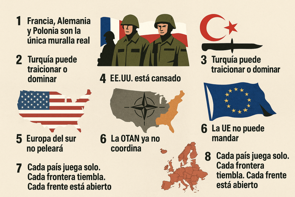 En síntesis, Europa encara un tablero de cinco frentes donde cada chispa reordena prioridades. El diseño adversario es claro: dispersión, fatiga y costes asimétricos. Por eso Francia–Alemania–Polonia planifican no una guerra, sino varias a la vez.